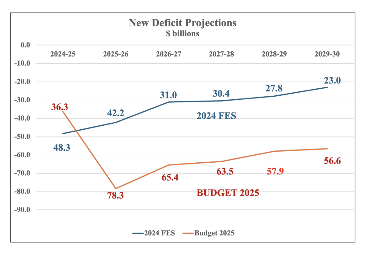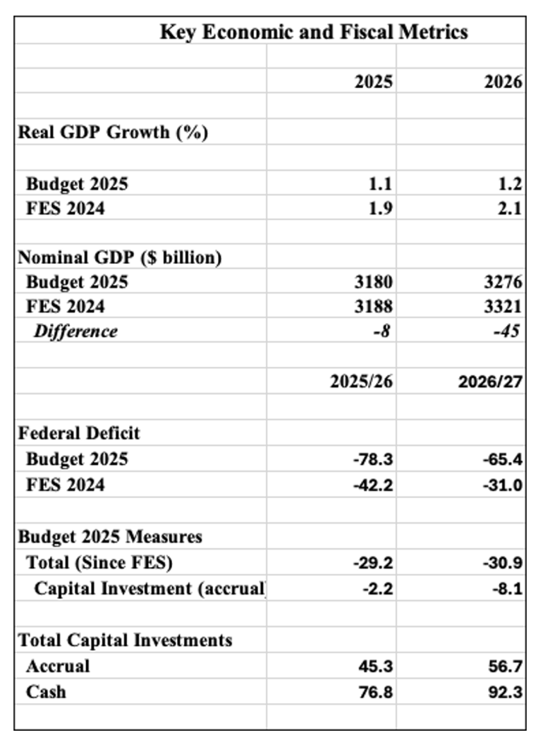 Budget 2025 is tabled in a period of significant economic weakness. Growth projections have been cut in half. Real GDP is expected to grow in the 1 percent range in 2025 and 2026 (Table 1). Weak growth means higher unemployment. In a $3.3 trillion economy, nominal GDP is down $45 billion in 2026. The higher projected deficits reflect a weaker economy and the government’s policy response. There are about $30 billion in new budget measures, primarily growth related, being injected into the economy each year. There is a significant projected increase in the level of capital investment (accrual and cash). If the budget and budget implementation acts get Parliamentary approval, close monitoring will be required on implementation and economic outcomes.