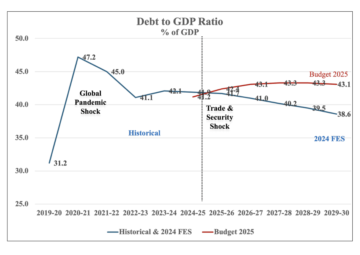 The debt-to-GDP ratio in Budget 2025 rises modestly and then flattens. Finance analysis indicates that the fiscal structure is sustainable over the long term. Fiscal room or buffers have been used to address the ongoing trade and security shock. Chart 3 shows that progress was being made in lowering the debt-to-GDP ratio since the global pandemic. Some of this progress is being reversed. There are no free lunches. Higher debt means higher interest costs.