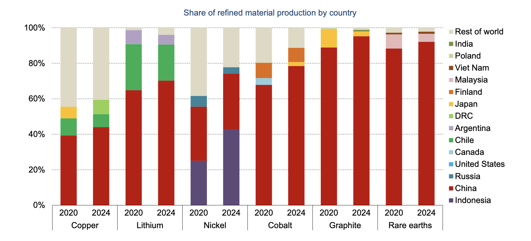 Right-sizing the China challenge means seeing both dominance and vulnerability. China has accumulated much strength in the midstream: refining and processing. It controls an average share of 70% of refining of 19 out of the 20 most important critical minerals tracked by the IEA, with rates above 90% for graphite, and rare earths. Even more striking, between 2020 and 2024, China added almost all of the growth in global refining output: cobalt (97%), rare earths (96%), graphite (98%) and even copper (83%).