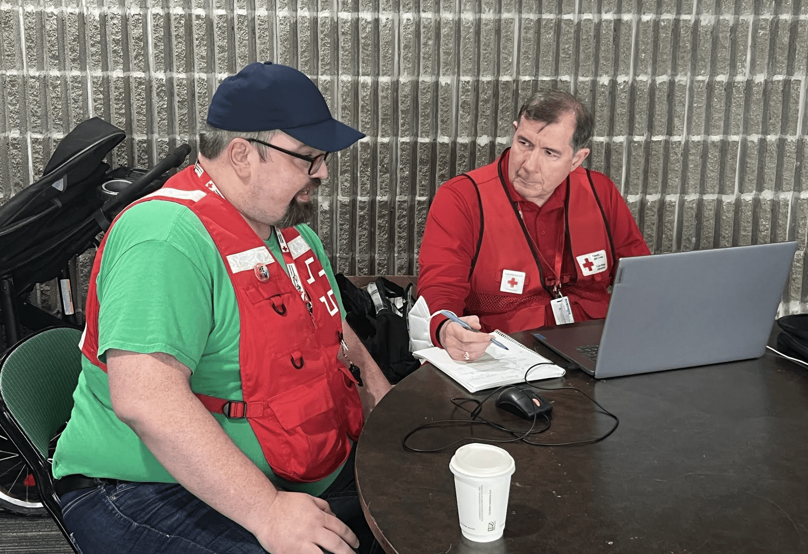 With Red Cross colleague Corey Jakobsze in Winnipeg, assessing the needs of evacuees from this summer’s Manitoba wildfires/Canadian Red Cross