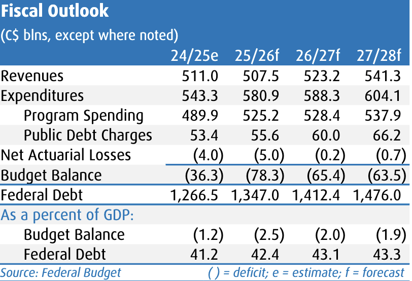 Looking out over the five-year projection horizon, there is almost $90 billion of net new stimulus including recently made announcements. Of that total, roughly $36 billion is in the form of tax relief; $63 billion is in defence; $13 billion is in direct infrastructure; $28 billion is in other government spending; all of which is offset by $51 billion in government efficiency savings. Additionally, Ottawa is banking on an acceleration in private-sector investment with the aid of fast-tracked approvals across a range of projects/industries—that’s certainly encouraging, but success there will depend highly on execution.