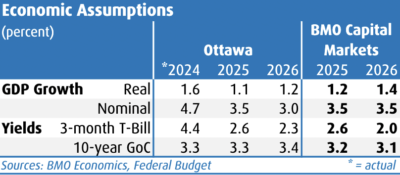 The budget projections are based on the private-sector consensus, but it’s a somewhat precarious one given the current unsettled state of tariffs and trade negotiations. Suffice it to say there is risk to this outlook, in both directions. The budget is based on real GDP growth of 1.1% this year (BMO Economics is at 1.2%), and 1.2% next year (1.4%). This marks a below-potential run rate into 2026 before past rate cuts and (presumably) some certainty on the trade front lend a hand. Ottawa expects nominal growth at 3.5% this year and 3.0% 2026 (we’re at 3.5% for both years). Medium term real GDP growth runs around the 2.0% mark, although potential growth could be challenged by slower population growth and ongoing productivity challenges—we’ll see if the latter can pick up the slack.